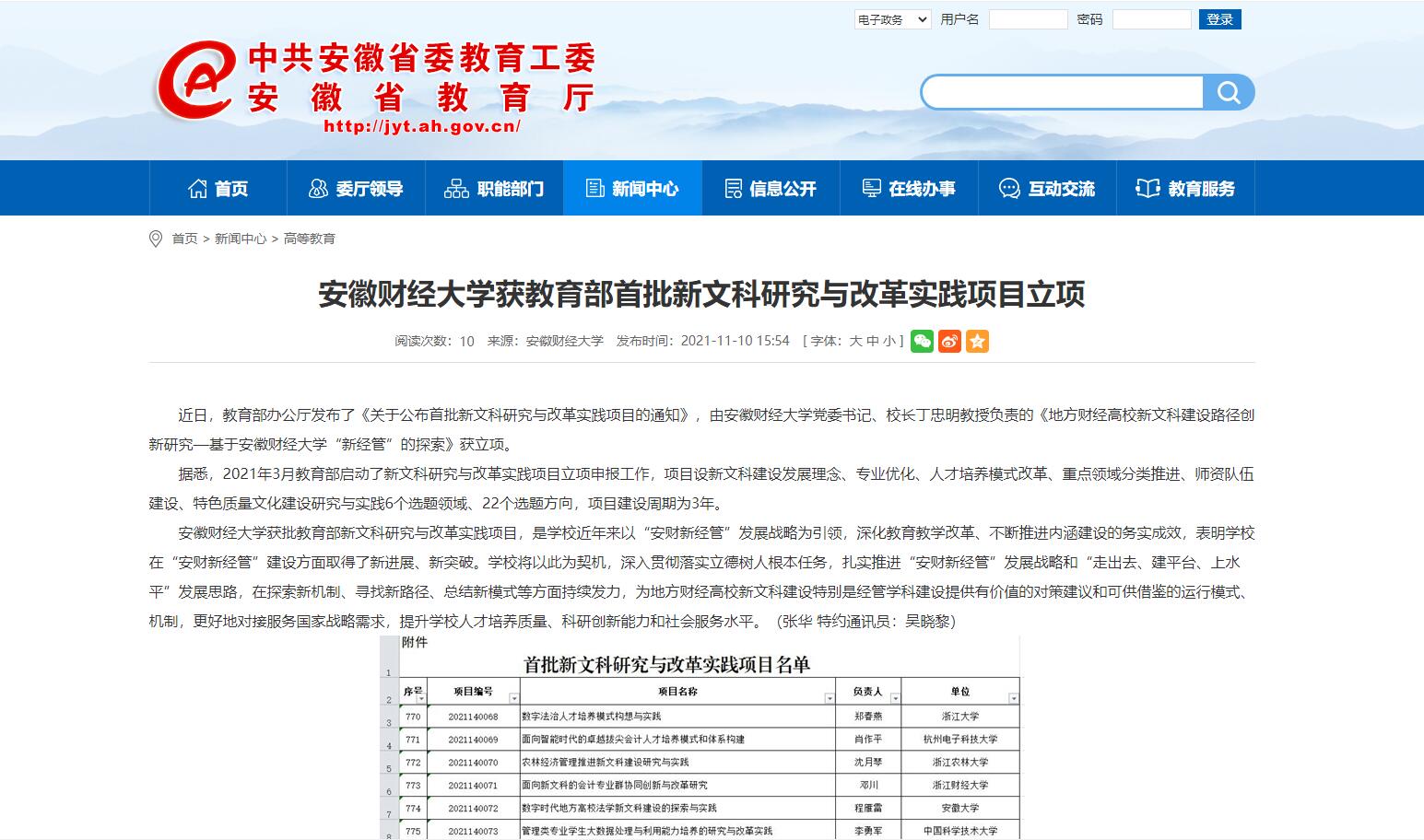 11月11日,安徽教育网报道我校获批首批新文科研究与改革实践项目立项