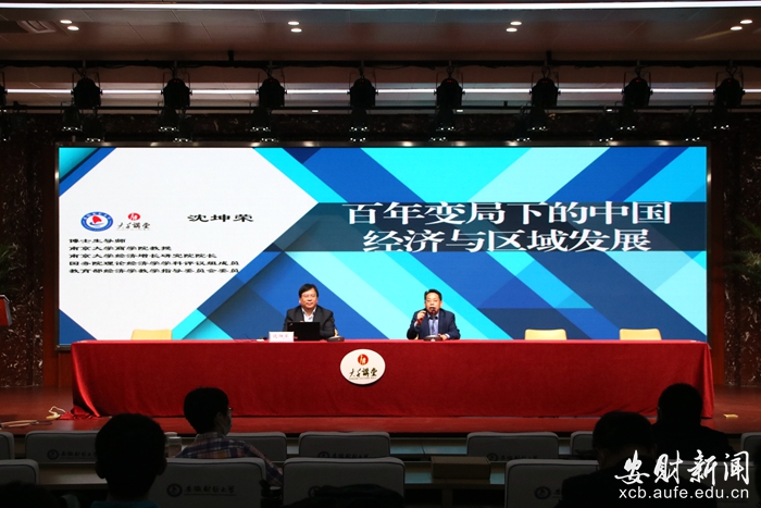 11月13日下午,“大千讲堂”第二十九讲在东校区求真楼学术报告厅开讲。南京大学经济增长研究院院长、国务院理论经济学学科评议组成员、教育部经济学教学指导委员会委员沈坤荣教授作题为“百年变局下的中国经济与区域发展”的报告。我校党委常委、副校长周加来主持报告会,经济学院师生代表聆听了报告。
