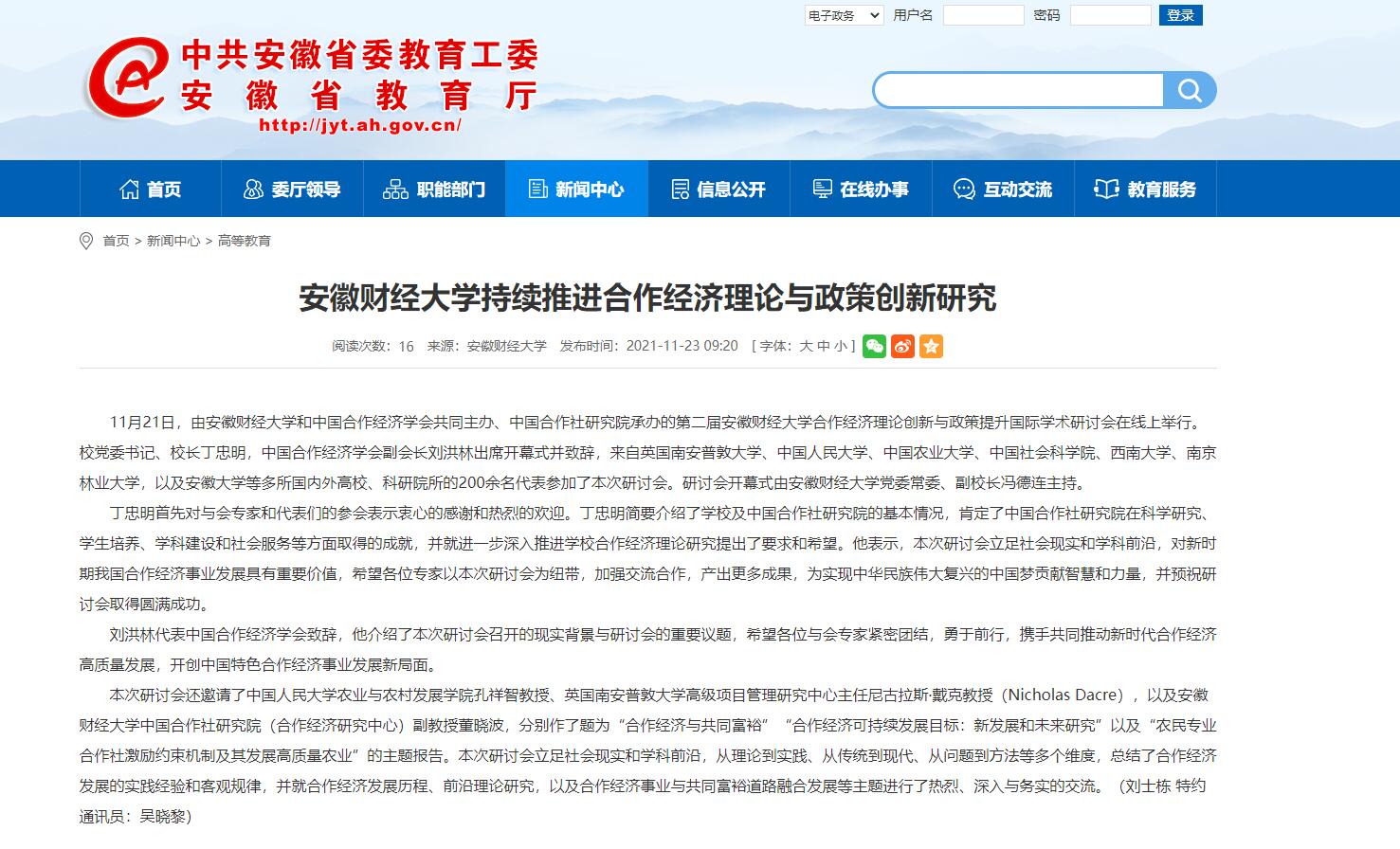 11月23日,安徽教育网报道第二届安徽财经大学合作经济理论创新与政策提升国际学术研讨会在线上举行。