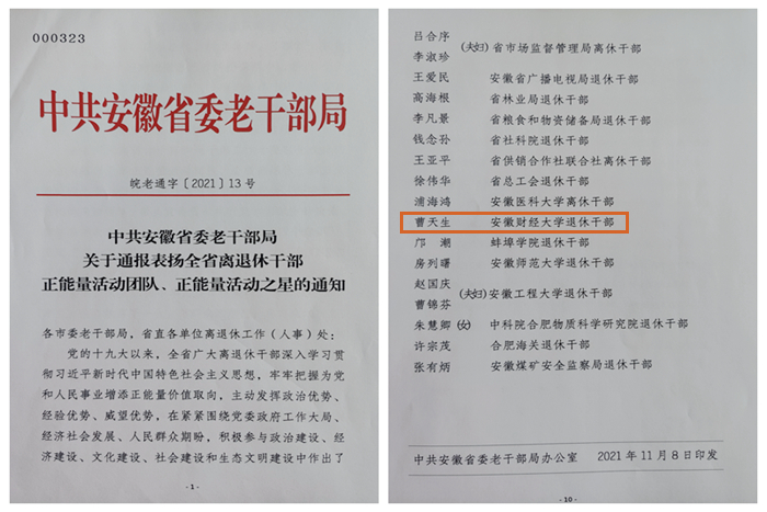 近日,中共安徽省委老干部局发布《关于通报表扬全省离退休干部正能量活动团队、离退休干部正能量活动之星的通知》,我校退休教职工曹天生荣获“全省离退休干部正能量活动之星”称号。