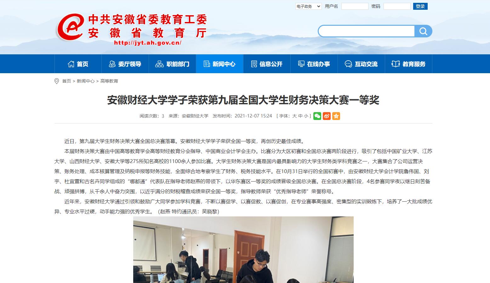 12月8日,安徽教育网、凤凰网、安徽新闻网报道我校学子荣获第九届全国大学生财务决策大赛一等奖。