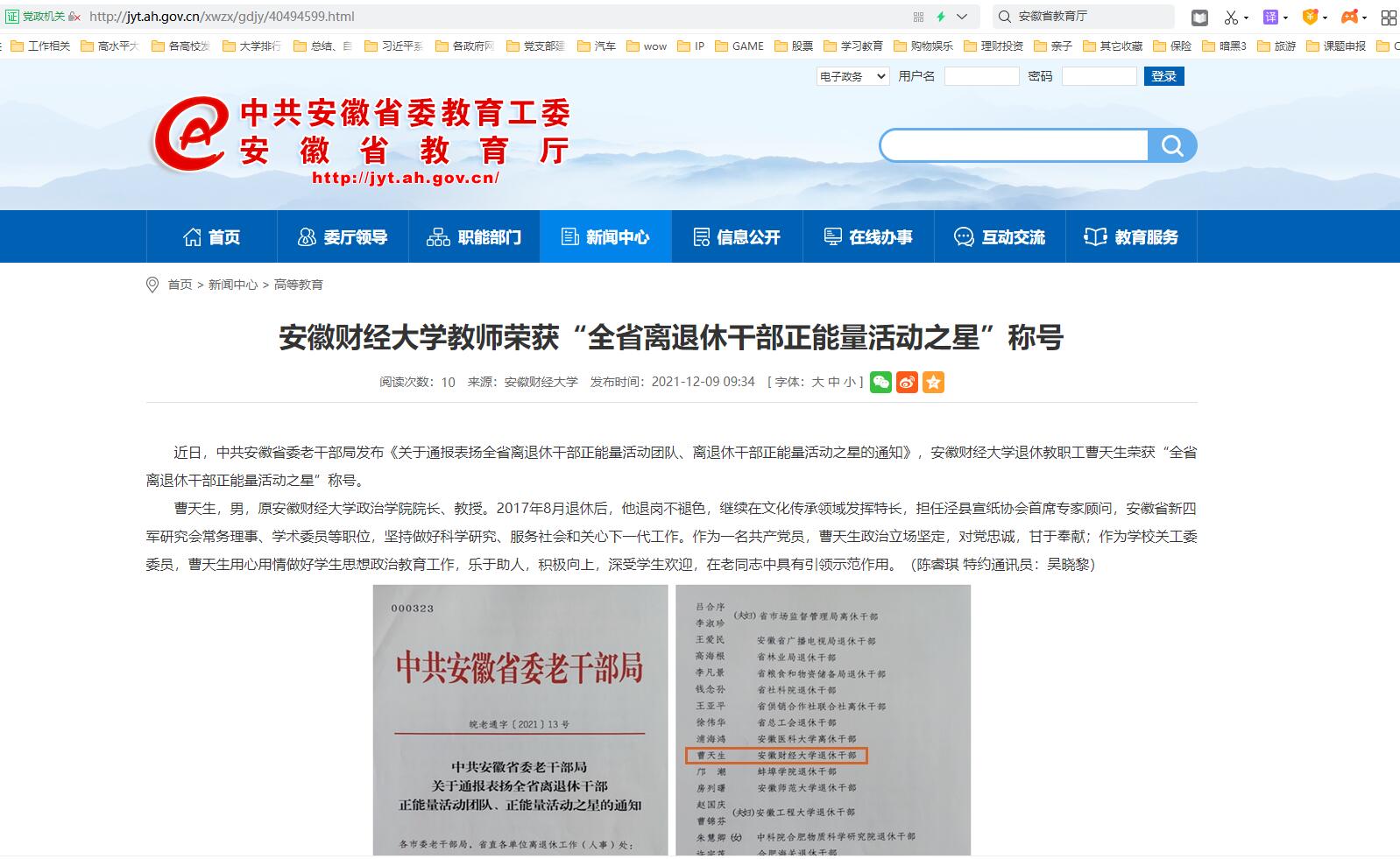 12月9日,安徽教育网报道我校教师荣获“全省离退休干部正能量活动之星”称号。