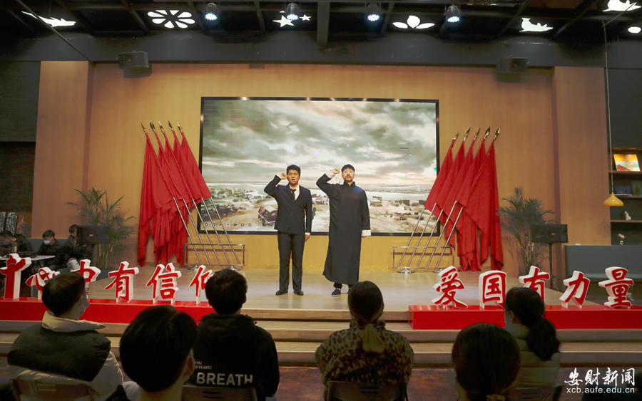 从迷茫彷徨到坚定信仰,从夹缝生存到全面小康……配乐诗朗诵《信仰让中国繁荣富强》,满含深情,铿锵有力,带领学子回顾披荆斩棘的百年复兴路。