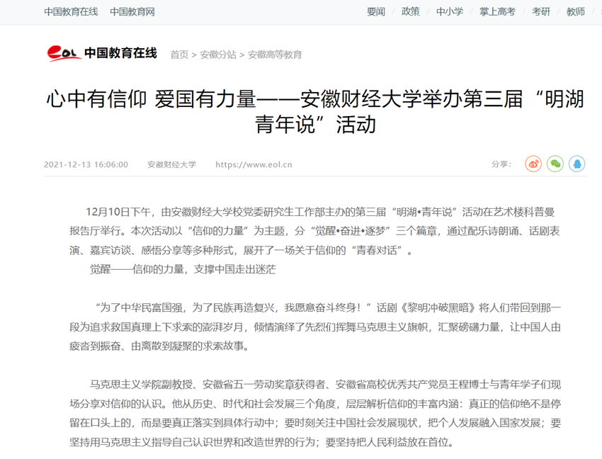 12月13日,中国教育在线、中安教育网报道:心中有信仰 爱国有力量——安徽财经大学举办第三届“明湖•青年说”活动。
