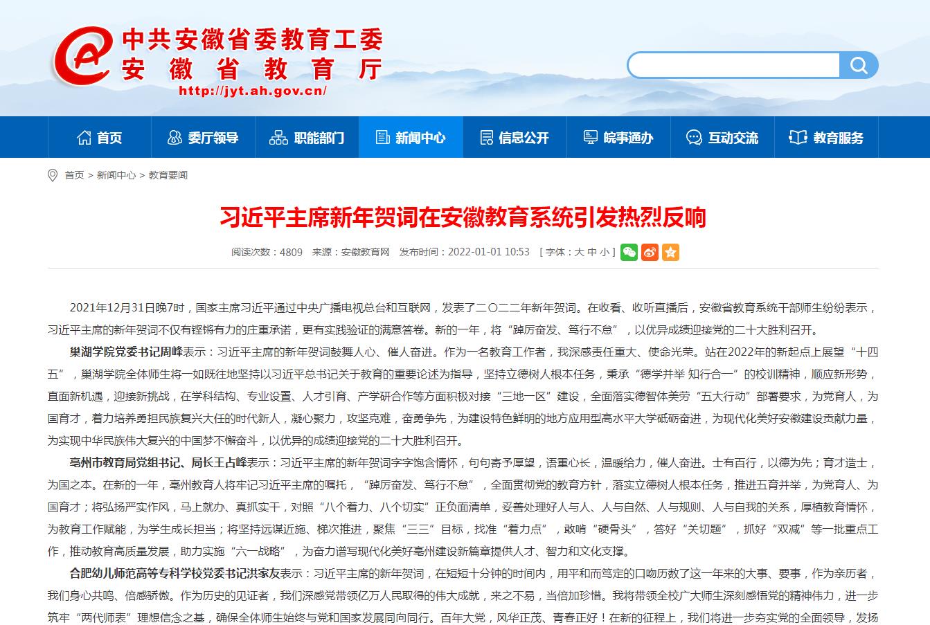 1月1日,安徽教育网教育要闻以《习近平主席新年贺词在安徽教育系统引发热烈反响》为题,报道我校学生热议国家主席习近平发表二〇二二年新年贺词。