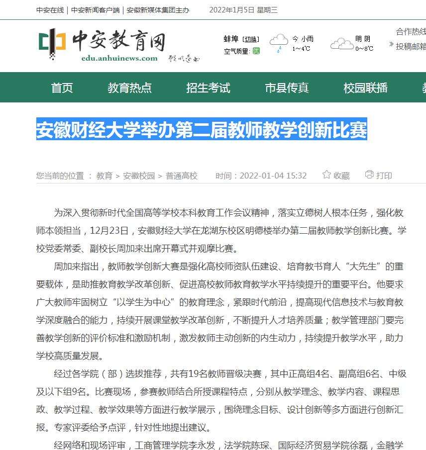 1月4日,中安教育网以《安徽财经大学举办第二届教师教学创新比赛》为题,报道我校举办第二届教师教学创新比赛。