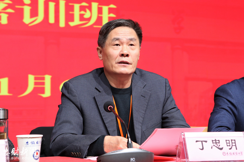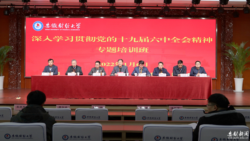 1月6日,安徽财经大学深入学习贯彻党的十九届六中全会精神专题培训班在龙湖东校区求真楼报告厅举行。党委书记、校长丁忠明,党委副书记杨烨,党委副书记、常务副校长朱红军,党委常委、副校长周加来、冯德连、程刚,副校长张焕明出席开班仪式。学校全体中层管理干部参加培训。会议由杨烨主持。