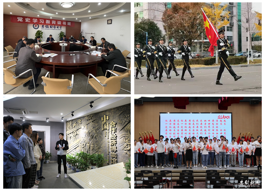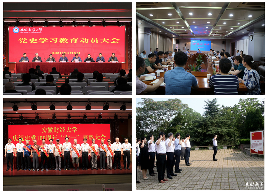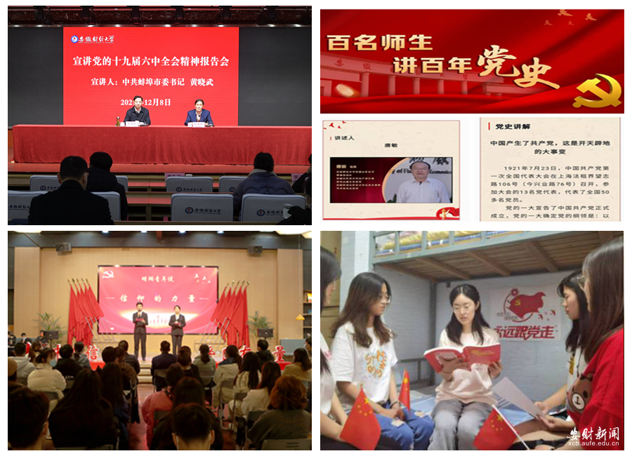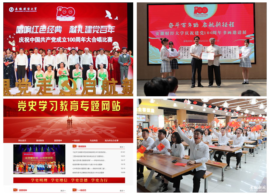 思想引领,强根铸魂。学校党委线上线下相结合,丰富和创新学习形式,营造党史学习教育浓厚氛围。线上,开设党史学习教育专题网站,在校园网主页上发布【学党史·庆百年】【学习贯彻党的十九届六中全会精神】等专题专栏,集中报道学校党史学习教育工作经验和先进典型。截至目前,学校累计发布党史学习教育专栏文章227篇,学校官方微信公众号推送【党史百年】学习文章80篇。人民网、学习强国、安徽日报等主流媒体累计报道学校党史学习教育75次。线下,举办庆祝建党100周年“七一”表彰大会、大合唱比赛、书画展,举办建党100周年文艺展演等,将党史学习教育与师生日常学习、生活深入结合,教育引导师生在潜移默化中传承红色基因,厚植爱党爱国情怀。