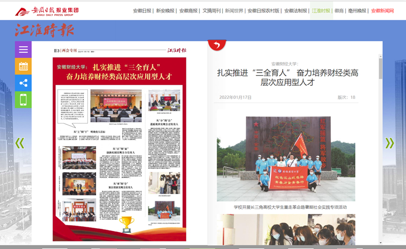 近日,《江淮时报》以《安徽财经大学:扎实推进“三全育人” 奋力培养财经类高层次应用型人才》为题,对我校“三全育人”工作成效进行了报道。