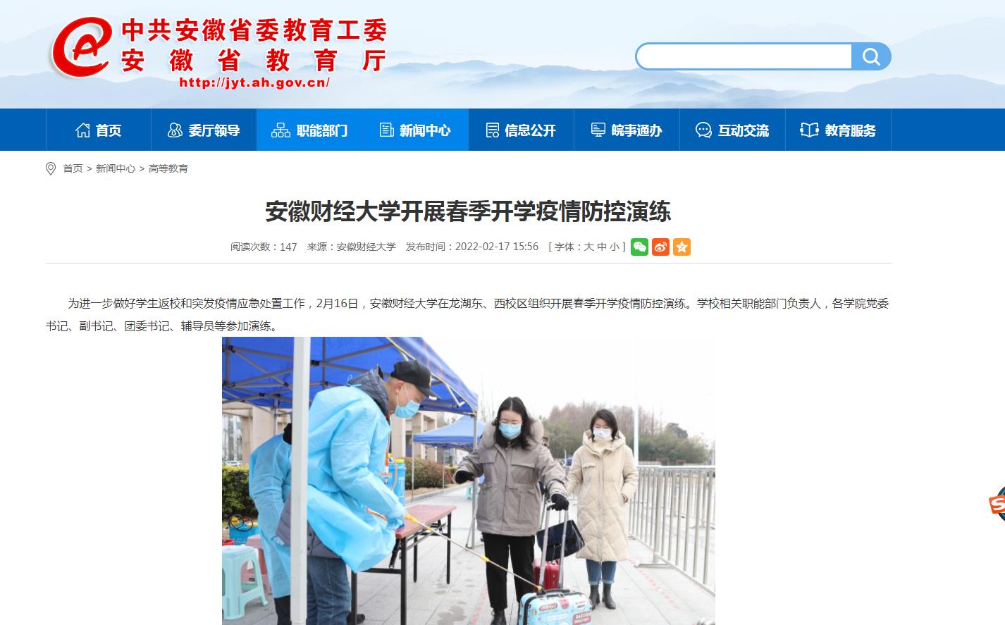 2月17日,安徽教育网以《安徽财经大学开展春季开学疫情防控演练》为题,对学校进行了专题报道。