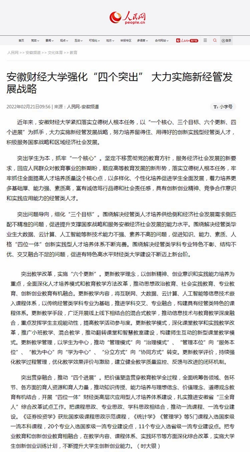 近日,人民网、凤凰网分别以《安徽财经大学强化“四个突出” 大力实施新经管发展战略》为题,报道我校新经管发展战略成效。