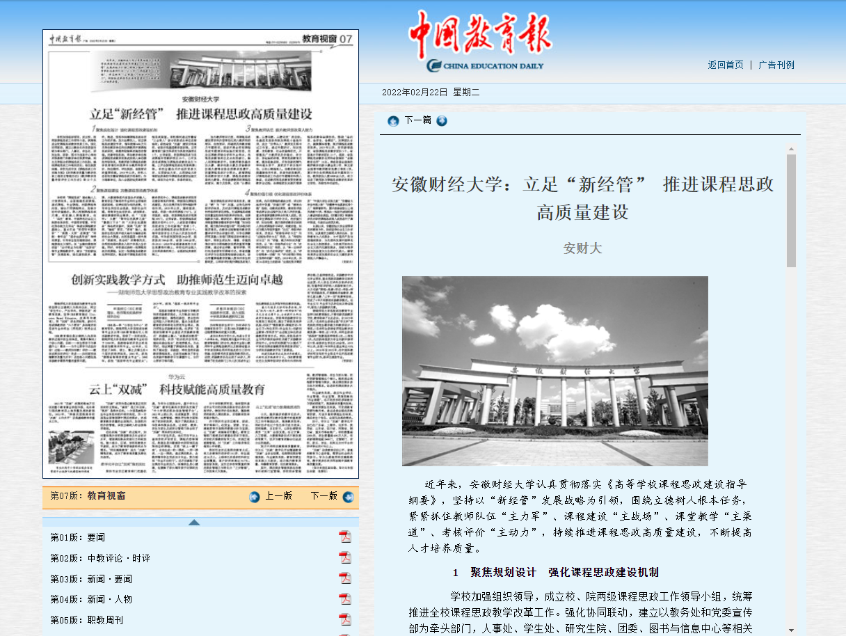 近日,《中国教育报》以《安徽财经大学:立足“新经管” 推进课程思政高质量建设》为题,报道我校“新经管”建设成效。全文如下: