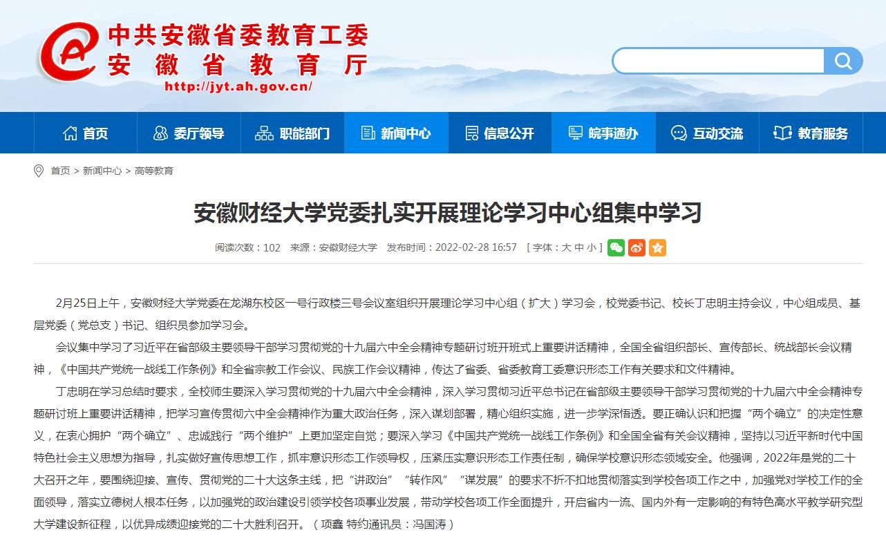 2月28日,安徽教育网以《安徽财经大学党委扎实开展理论学习中心组集中学习》为题,报道了我校扎实开展理论中心组集中学习。