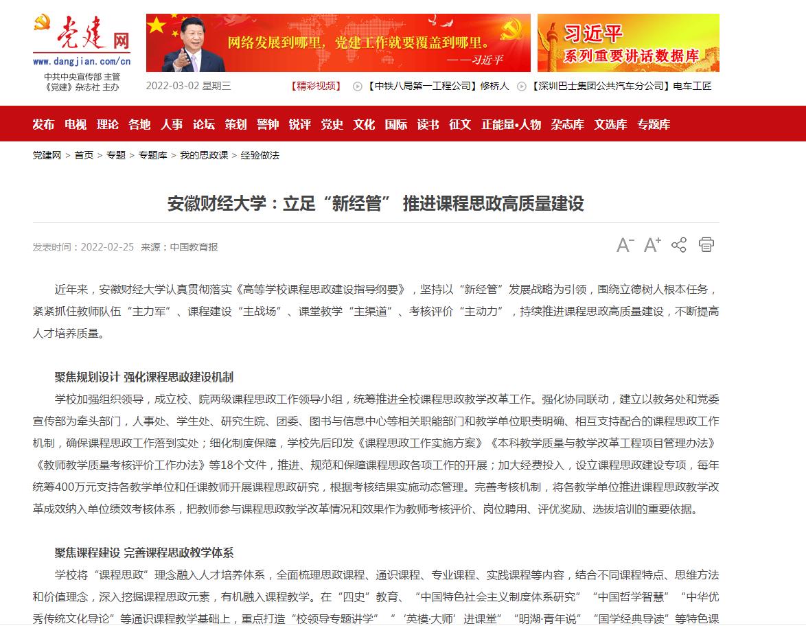 2月25日,全国党建网以《安徽财经大学:立足“新经管” 推进课程思政高质量建设》为题,报道了我校课程思政建设成效。