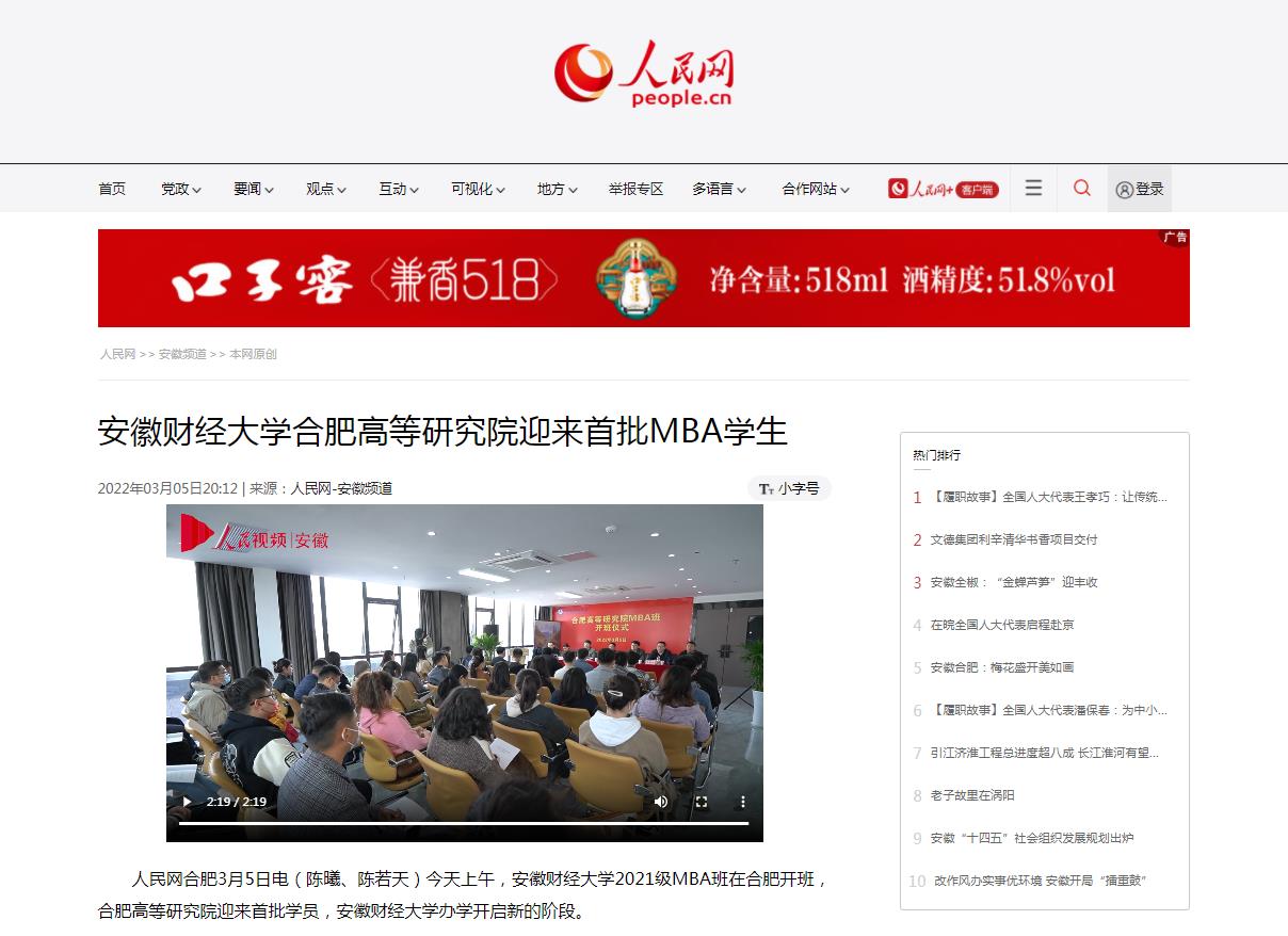 3月5日,人民网、安徽日报等媒体以《安徽财经大学合肥高等研究院迎来首批MBA学生》为题,报道了我校合肥高等研究院MBA班开班。