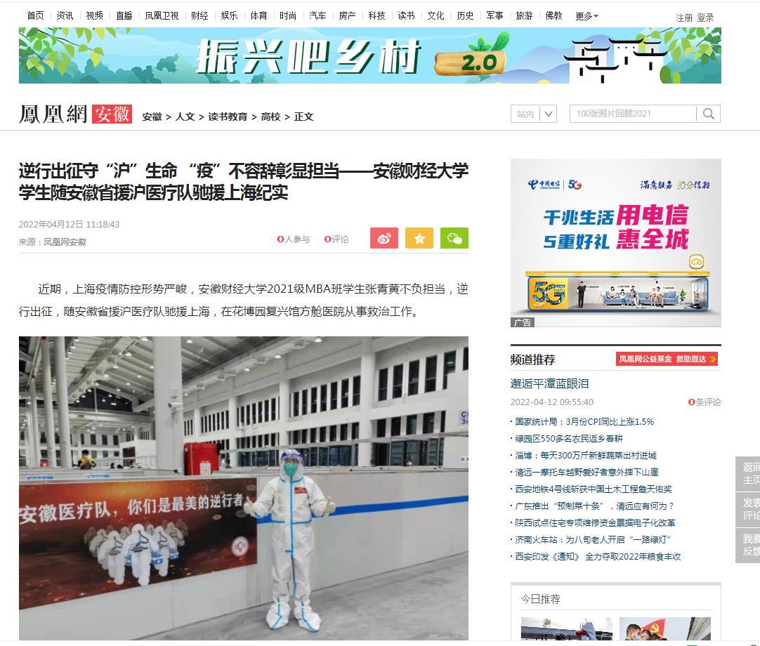 4月11日、12日,凤凰网、安徽日报分别以《逆行出征守“沪”生命 “疫”不容辞彰显担当 —— 安徽财经大学学生随安徽省援沪医疗队驰援上海纪实》为题,报道我校2021级MBA班学生张青黄不负担当,逆行出征,随安徽省援沪医疗队驰援上海,在花博园复兴馆方舱医院从事救治工作。相关报道具体链接如下: