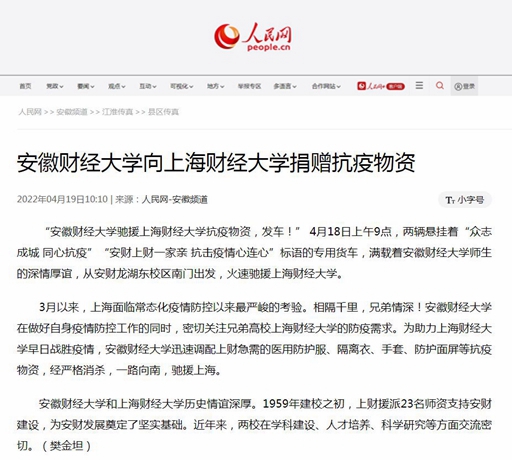 近日,人民网、安徽电视台、安徽新闻网、凤凰网等媒体分别以《守望相助 风雨同担——安徽财经大学向上海财经大学捐赠抗疫物资》为题,报道我校捐赠疫情防控物资。