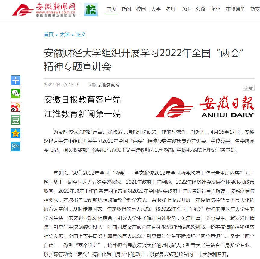 4月25日,凤凰网、安徽新闻网以《》为题,报道我校积极组织开展2022年全国“两会”精神专题宣讲。
