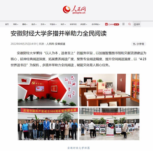 4月25日,人民网以《安徽财经大学多措并举助力全民阅读》为题,报道我校多措并举助力全名阅读。