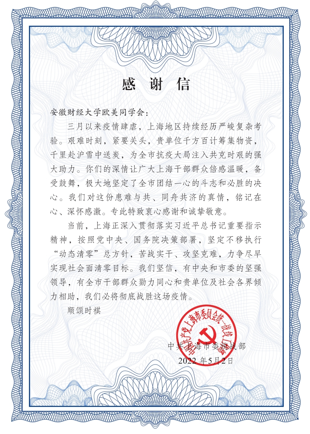 来函称,三月以来疫情肆虐,上海地区持续经历严峻复杂考验,艰难时刻,紧要关头,安徽财经大学欧美同学会雪中送炭,为上海市抗疫大局注入共克时艰的强大助力。安徽财经大学欧美同学会这种患难与共、同舟共济的真情,极大地坚定了全市团结一心的斗志和必胜的决心。