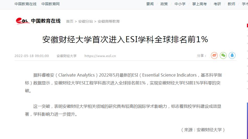 5月18日,中国教育在线以《安徽财经大学首次进入ESI学科全球排名前1%》为题,报道我校相关领域的研究具有较高的国际学术影响力,标志着我校学科建设成效显著,学科影响力进一步提升。