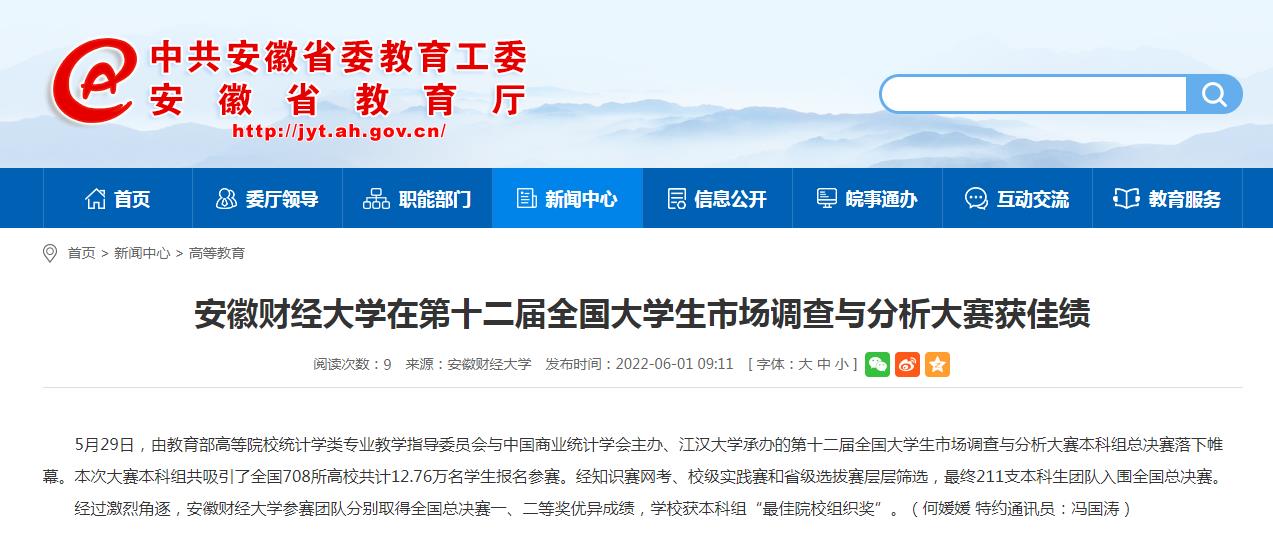 6月1日,安徽教育网以《安徽财经大学在第十二届全国大学生市场调查与分析大赛获佳绩》为题,报道我校在第十二届全国大学生市场调查与分析大赛当中获佳绩。