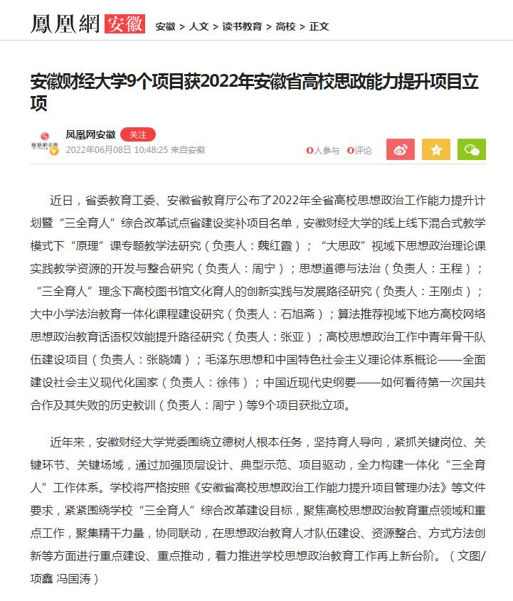 6月8日,凤凰网以《安徽财经大学9个项目获2022年安徽省高校思政能力提升项目立项》为题,报道了我校9个项目获2022年安徽省高校思政能力提升项目立项。