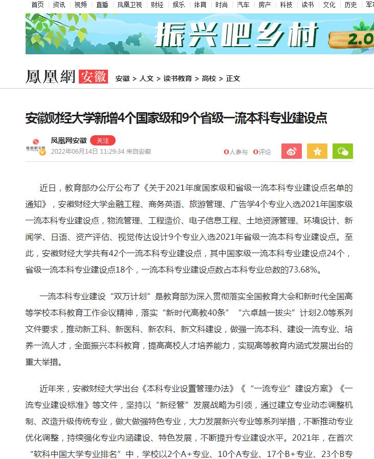 6月14日,凤凰网、安徽新闻网以《安徽财经大学新增4个国家级和9个省级一流本科专业建设点》为题,报道我校专业建设成效。