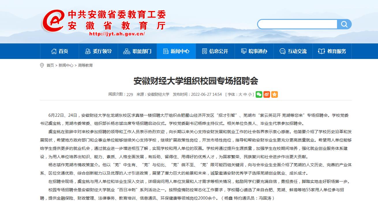 6月27日,安徽教育网以《安徽财经大学组织校园专场招聘会》为题,报道学校扎实开展2022届毕业生就业创业工作。