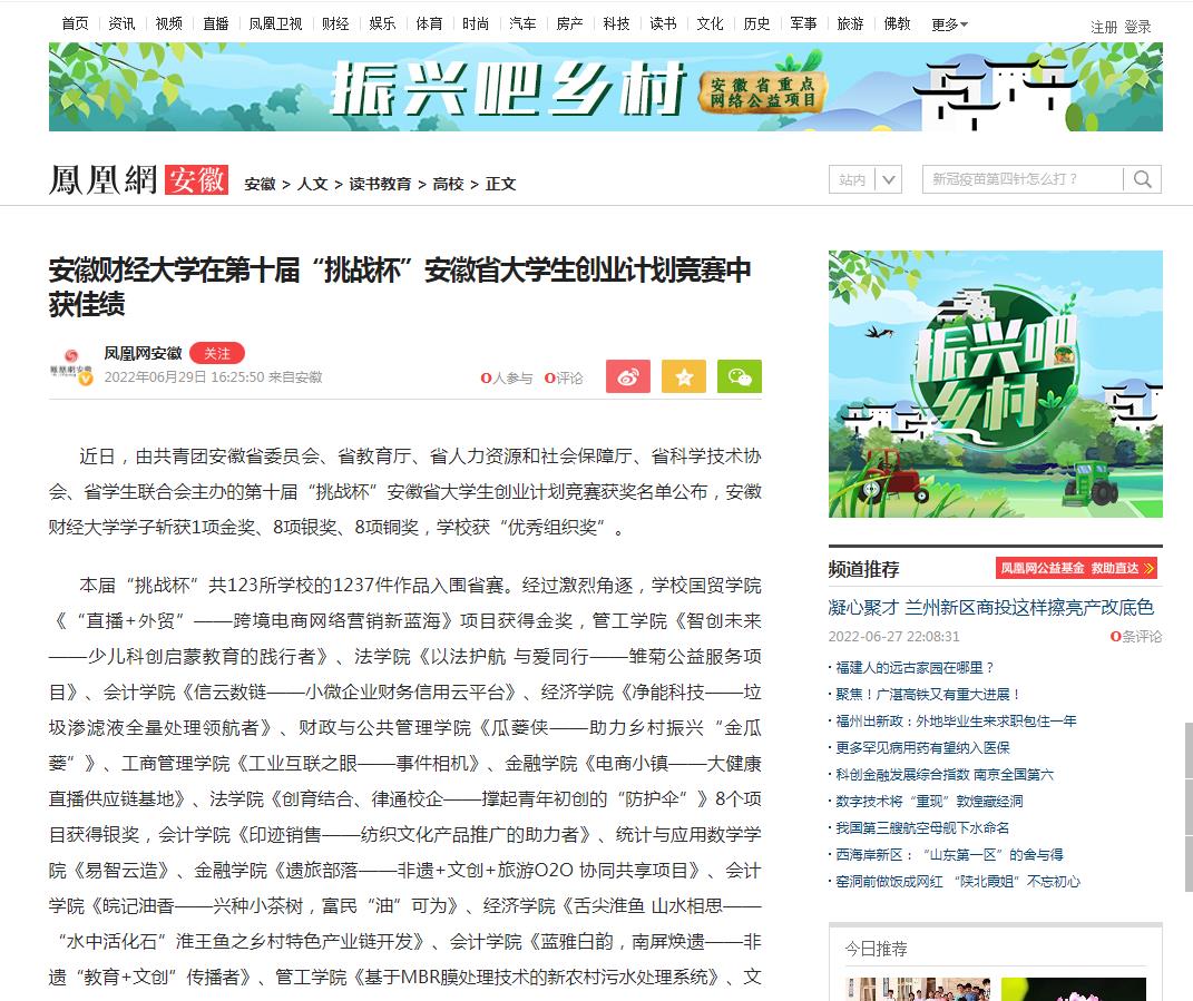 6月29日,凤凰网、安徽新闻网分别以《安徽财经大学在第十届“挑战杯”安徽省大学生创业计划竞赛中获佳绩》为题,报道我校在第十届“挑战杯”安徽省大学生创业计划竞赛中赛果丰硕。