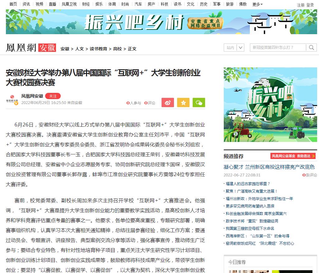 6月29日,凤凰网、安徽新闻网分别以《安徽财经大学举办第八届中国国际“互联网+”大学生创新创业大赛校园赛决赛》为题,报道我校举办第八届中国国际“互联网+”大学生创新创业大赛校园赛决赛。