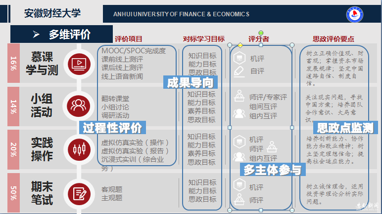 教学评价内容多维化。综合考虑德智体美劳全面发展要求,重构教学评价内容,突出价值、能力和素质导向,由原来“单一”评价内容向“多维”评价内容转变,由主要注重知识传授向更加注重全面发展转变。在课程教学大纲、教学设计、教材选编与使用等重要教学载体审核中考量“知识传授和能力提升、价值引领”同步提升的落实情况,在教学过程管理和教学质量评价中突出价值引领和能力提升,引导任课教师将其融入到每门课程目标和教学过程中,作为课程教学效果的重要考量因素。