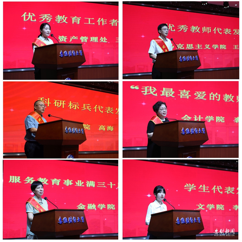 资产管理处王超琼、马克思主义学院王程、法学院高海、会计学院裘丽娅、金融学院左晓慧分别代表优秀教育工作者、优秀教师、科研标兵、我最喜爱的教师、服务教育事业满三十周年教职工先后发言。他们结合各自工作经历,分享了潜心学术、教书育人、服务育人的体会,表示要在今后的教学、科研和管理岗位上,继续发扬艰苦奋斗、甘于奉献精神,时刻保持进取之心、责任之心、敬畏之心、感恩之心,尊重学生、关爱学生、培养学生,做“四有”好老师,做学生成长成才的引路人。学生代表、文学院李琳同学表达了对老师们深切的感恩之情,并向老师们送上最真挚的祝福。