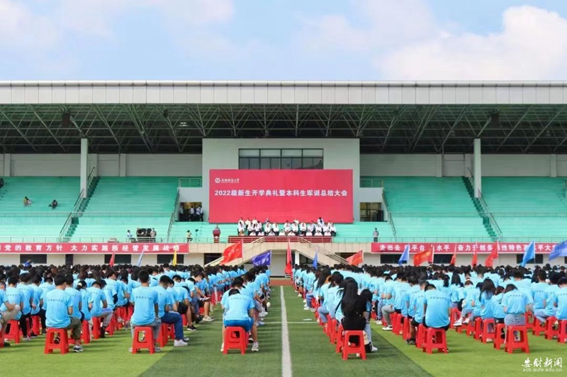 9月18日上午,安徽财经大学2022级新生开学典礼暨军训总结大会在龙湖东校区西体育场举行。校党委书记虞宝桃,校党委副书记杨烨,校党委副书记、常务副校长朱红军,校党委常委、副校长周加来,副校长张焕明,党委常委、纪委书记、监察专员武刚,学术副校长何贤杰出席活动。学校各职能部门主要负责人,各学院(部)党政主要负责人,党委副书记,团委书记、全体军训教官,杰出校友代表、新生辅导员(班主任)以及2022级全体新生参加了活动。活动由周加来主持。
