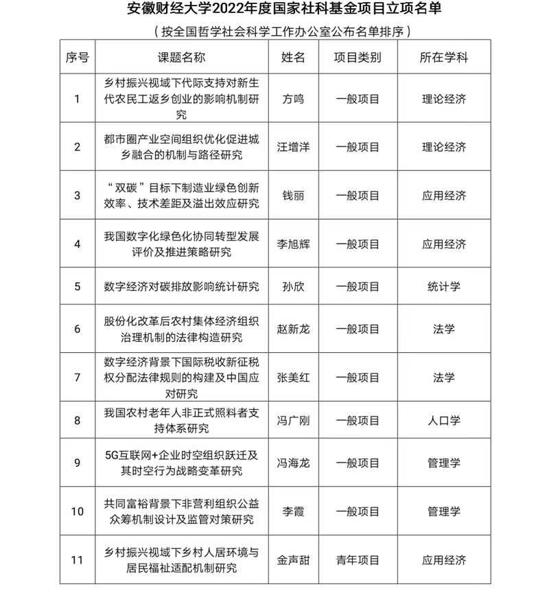 9月30日,全国哲学社会科学工作办公室公布了2022年度国家社会科学基金年度项目与青年项目立项结果。我校获批11项,其中,一般项目10项,青年项目1项。
