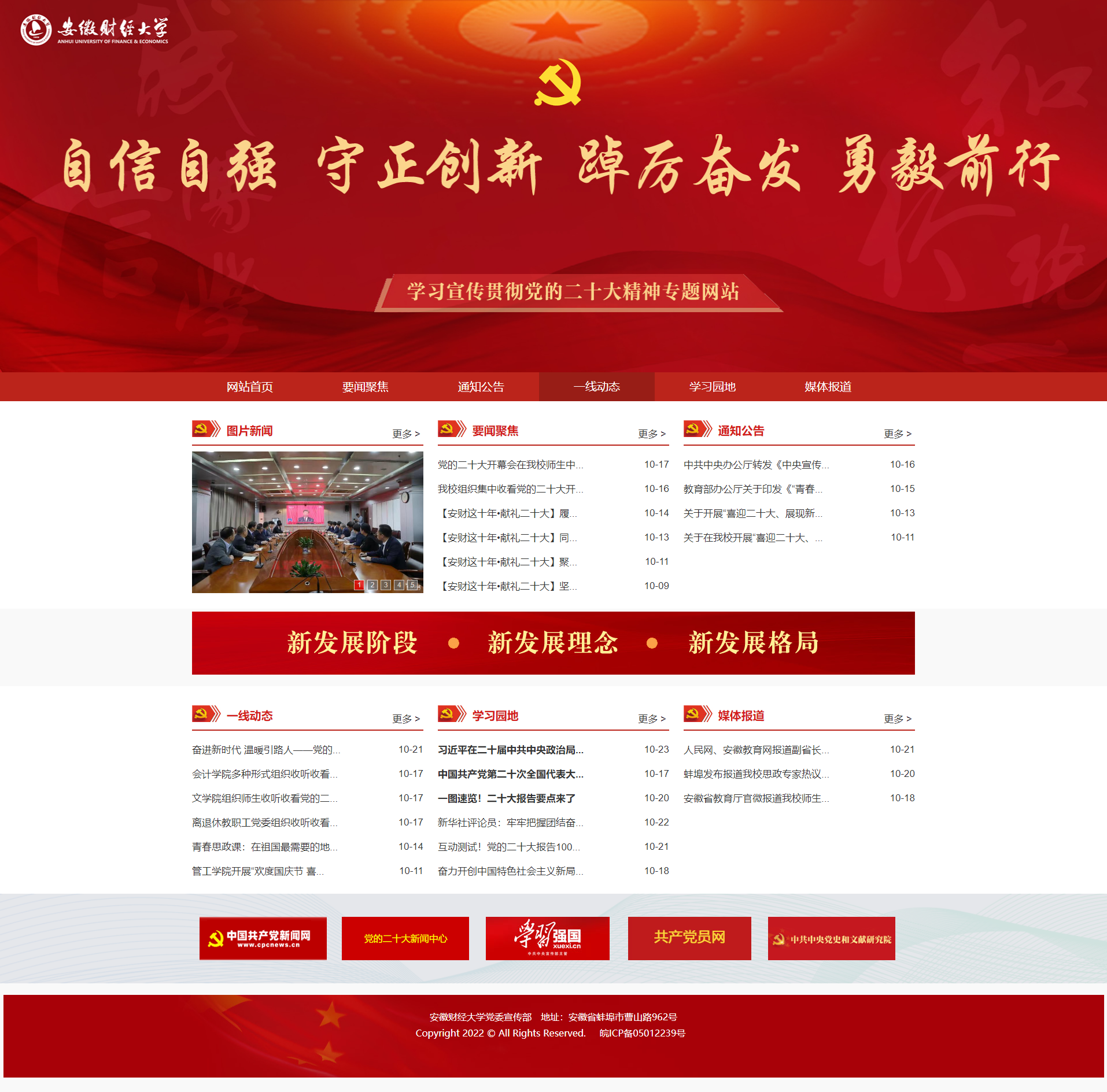 为深入学习宣传贯彻习近平新时代中国特色社会主义思想和党的二十大精神,全面反映学校学习宣传贯彻党的二十大精神的生动实践,安徽财经大学学习宣传贯彻党的二十大精神专题网站于10月23日正式上线。