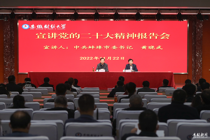 11月22日上午,蚌埠市委书记黄晓武来校宣讲党的二十大精神。校党委书记虞宝桃主持报告会。校党委副书记、常务副校长朱红军,校党委常委、副校长周加来出席报告会,学校中层管理干部、师生代表聆听了报告。