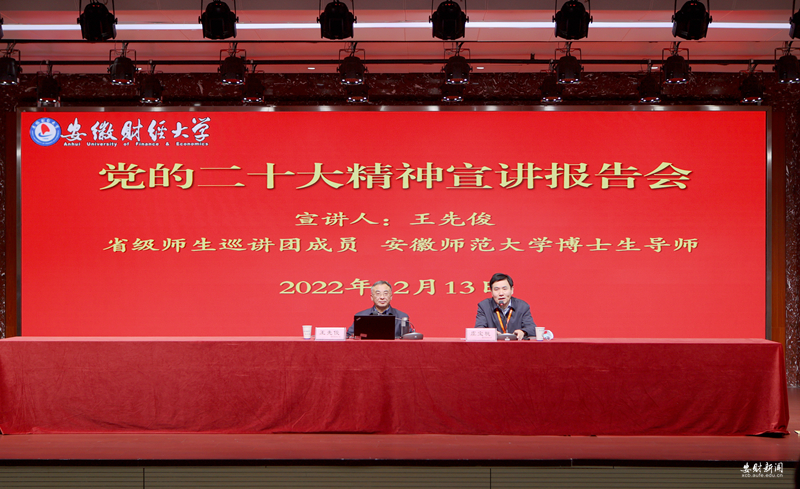 12月13日下午,省级师生巡讲团成员、省政协文化文史和学习委员会副主任、安徽师范大学博士生导师王先俊教授来校宣讲党的二十大精神。校党委书记虞宝桃主持报告会。校党委副书记、常务副校长朱红军,副校长张焕明,学术副校长何贤杰出席报告会。学校中层管理干部、学校学习宣传贯彻党的二十大精神宣讲团成员、师生代表现场聆听了报告。