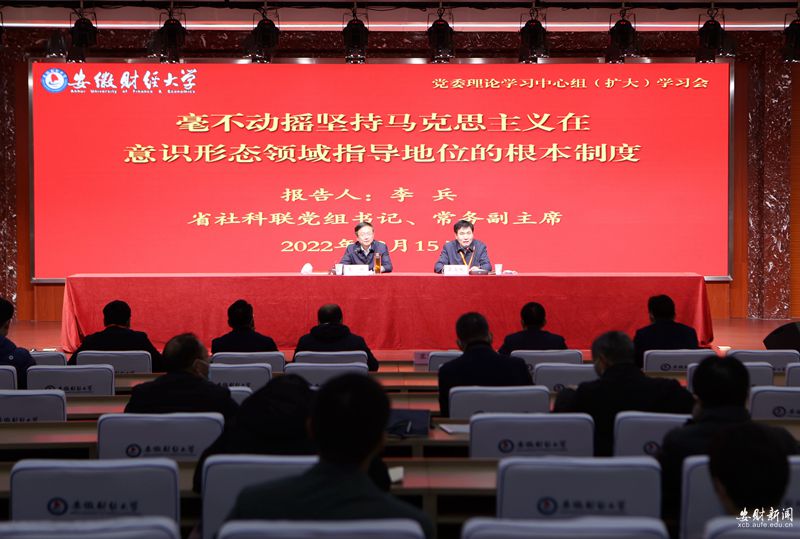 李兵围绕“毫不动摇坚持马克思主义在意识形态领域指导地位的根本制度”这一主题,重点介绍了党的二十大报告对意识形态工作作出的新部署新要求。他从坚持马克思主义在意识形态领域指导地位的历史必然性、习近平总书记关于意识形态工作的重要论述、当前意识形态领域面临的风险和挑战、不断提高意识形态工作治理水平四个方面作了系统、全面、深刻阐述。李兵指出,坚持马克思主义在意识形态领域指导地位的根本制度有着深厚的历史逻辑、严密的理论逻辑和丰富的实践逻辑。坚持马克思主义的指导地位是近代中国社会发展的必然选择;中国共产党坚定不移地坚持以马克思主义为指导,最关键的是马克思主义具有科学性和真理性;马克思主义是中国共产党人的精神之“钙”,只有坚持马克思主义在意识形态领域指导地位的根本制度,才能坚定不移地走中国特色社会主义道路。他强调,意识形态工作是党的一项极端重要的工作,高校是意识形态工作的前沿阵地。要旗帜鲜明坚持党管办学方向、党管意识形态,牢牢掌握高校意识形态工作领导权、管理权和话语权,建设具有强大凝聚力和引领力的社会主义意识形态。要学习好宣传好贯彻好党的二十大精神,坚持守正创新,不断提高政治站位,创新工作方式方法,增强自身业务能力,汇聚意识形态工作强大合力,做到守土有责、守土负责、守土尽责。