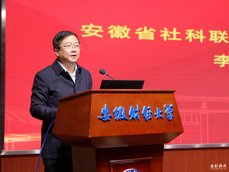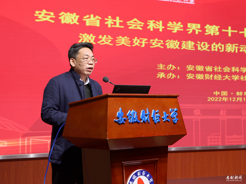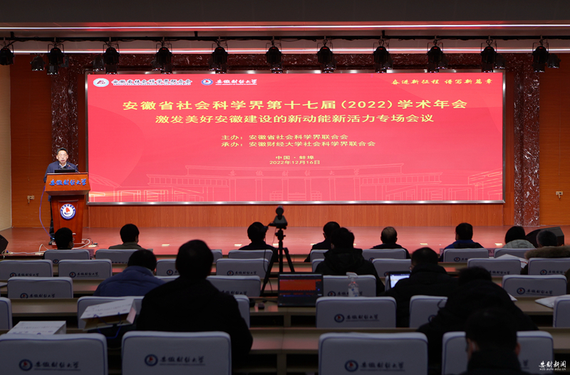 12月16日,由安徽省社科联主办、安徽财经大学社科联承办的安徽省社会科学界第十七届(2022)学术年会激发美好安徽建设的新动能新活力专场会议在我校求真楼报告厅召开。安徽省社科联党组书记、常务副主席李兵,安徽省社科联秘书长、学会工作处处长、一级调研员韩修良,我校党委书记虞宝桃,校党委常委、副校长周加来出席开幕式。来自全省社科界百余名专家学者参加会议。会议由周加来主持。