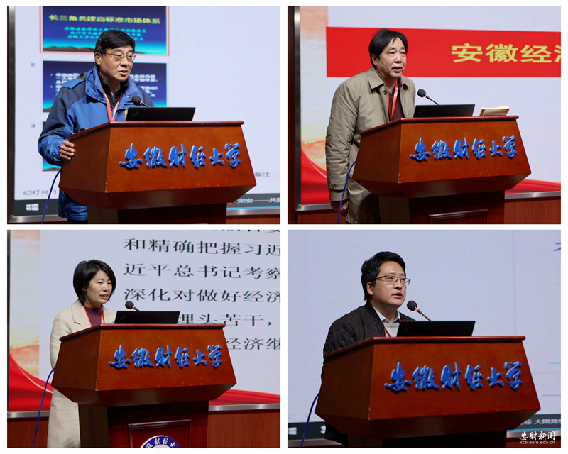 在报告环节,安徽大学创新发展研究院副院长、研究员宋宏教授作了“长三角共建高标准市场体系”的报告。他指出,加快建设全国统一大市场的重大部署,是畅通国内大循环、促进国内国际双循环的重要基础,新发展格局下要着力打造市场、产业、科技创新、城市群、生态、对外开放等六个体系。其中,市场体系的构建是国民经济的基础,市场体系建设的重点是要素市场体系。未来要通过构建高效、有序的新要素市场,加快探索新的成果,不断推动创新经济社会发展。安徽工业大学商学院党委书记洪功翔教授作了主题为“安徽经济崛起的逻辑与前景展望”的报告,他从安徽经济呈现良好的崛起态势、安徽经济崛起的逻辑、安徽经济崛起的前景展望等三个方面进行了阐述,分析了安徽经济崛起的原因;安徽师范大学法学院副教授仇凤仙作了主题为“生计机会再造:乡村振兴视域下第一代农民工生计重构研究”的报告,基于社会学、经济学等多元化角度,以微观的视角,从乡村振兴视角下对农民工城乡专场的生计问题进行了剖析;安徽财经大学统计与应用数学学院教授崔连标作了主题为“大国竞争背景下中国芯片进口易损性及其经济影响评估”的报告,从理论层面探究芯片禁运对经济系统的影响机理,对我国芯片封锁下的经济影响进行侧重分析,通过得出的结论给予了相应建议。
