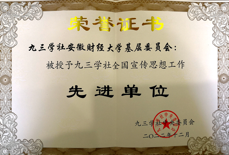 近日,经九三学社中央委员会十四届七十四次主席办公会议研究决定,评选表彰一批先进基层组织,九三学社安徽财经大学基层委员会被授予“全国宣传思想工作先进单位”称号。