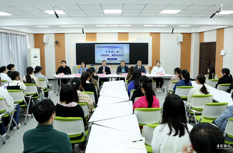 教务处副处长廖信林,安徽省优秀辅导员宗惠,马克思主义学院2021级马克思主义中国化研究专业硕士研究生赵欲隆,会计学院2020级审计学专业本科生张驰,国际经济贸易学院2022级国际商务专业本科生杨丰睿分别围绕“本科人才培养及课程体系”“生涯规划”“本科、研究生及参军入伍期间学习生活”“专业学习、学科竞赛与社会实践”“新生经历与未来规划”作交流发言。