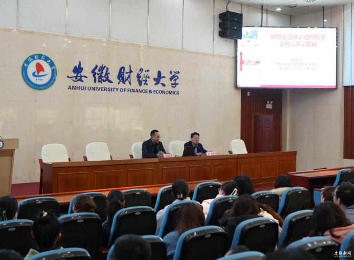 3月25日下午,应金融学院、科研处邀请,中国人民大学财政金融学院副院长、国家级人才特聘教授称号获得者、国家社科基金重大项目首席专家张成思教授在东校一号行政楼一楼报告厅作题为“中国金融体系结构转型支持高质量发展”的专题报告。金融学院部分师生聆听了报告。报告会由校党委常委、副校长周加来教授主持。