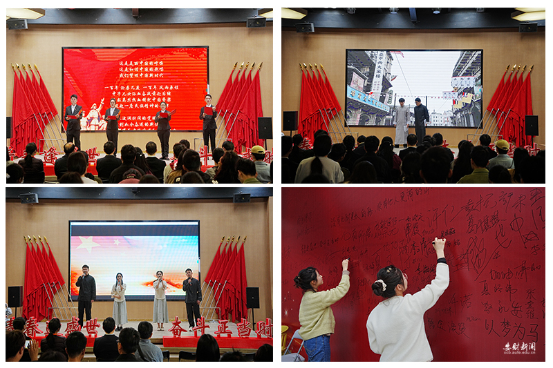 “青年强,则国家强”。青年志向远大、信念坚定是一个国家、一个民族无坚不摧的前进动力。作为新时代的奋斗者,安徽财经大学青年学子们已经拿起了历史的笔,扛起了时代的责任。活动现场,来自不同年级不同专业的优秀研究生代表们分享了自己的青春奋斗故事。学校第23届研究生支教团团长张骞说,“青年当有志,立志在四方,祖国需要处,皆是我故乡”,个人的力量虽然有限,但以沧海一粟汇成滚滚洪流,以滴水之晶反射太阳光辉,每年有成千上万的青年人奔赴祖国西部,相信在一代又一代青年人的努力下,祖国西部一定会更美好。退伍大学生士兵王磊谈及在海军服役时那段激情燃烧的人生历程,自豪地说“可以把每一滴热血都流进祖国的大海”!学生创业者赵欲隆多次在高级别学科竞赛中获奖,并创办个人公司、工作室,他豪情满怀感慨 “我们生逢盛世,施展才干的舞台无比广阔,我们必将书写新的历史”!笔耕不辍、潜心科研的朱同清说,“赓续前行,奋楫争先,我将以青春之笔续写爱国篇章、捍卫盛世中华”。雄关漫道真如铁,而今迈步从头越!站在历史的交汇点,青年一代满怀壮志豪情,高扬理想风帆,在中华民族伟大复兴的征途上乘风破浪、勇往直前。