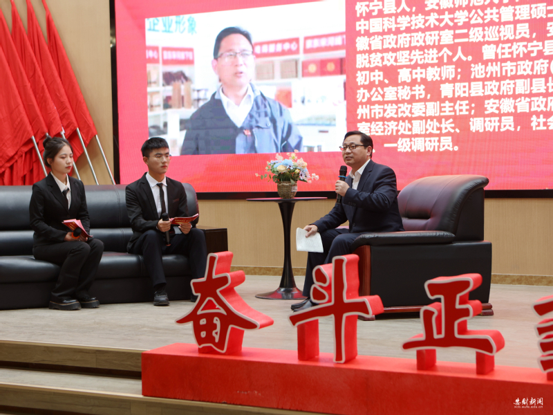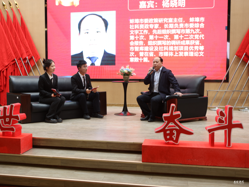 蚌埠市委政策研究室主任,蚌埠市社科资政专家杨晓明回答了新时代青年在追梦路上如何处理好仰望星空和脚踏实地的关系问题,勉励青年人要心怀“国之大者”并成为“行之实者”。他还热情邀请优秀的安财学子留在蚌埠,一起建设好蚌埠。