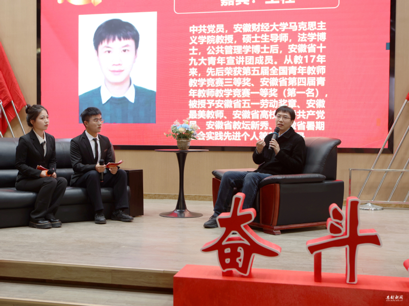 安徽省五一劳动奖章获得者、安徽省高校优秀共产党员,学校马克思主义学院教授王程老师用变与不变的辩证思考分析新时代的历史特征,指出新时代青年生逢其时,重任在肩,要将小写的生命变成推动历史进步的大写的生命,把青春熔铸在中华民族伟大复兴的征途中。