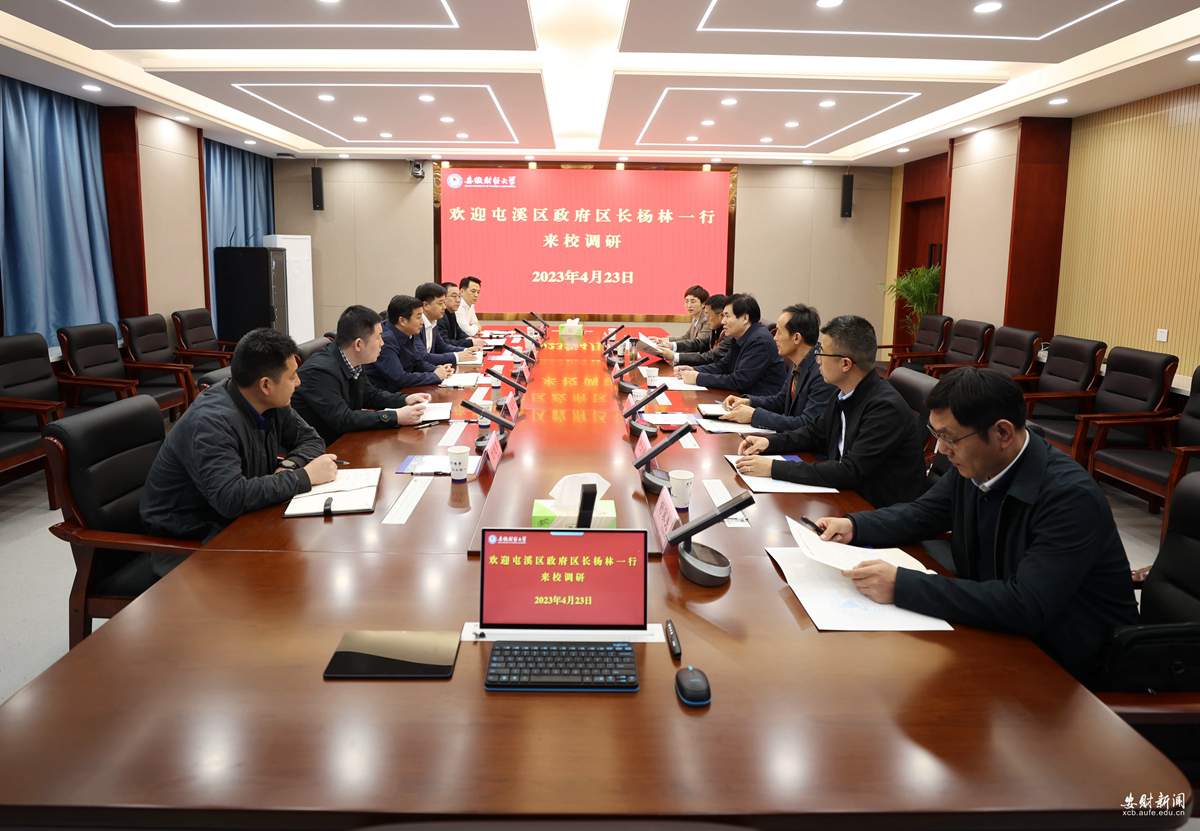 双方围绕推深做实安徽财经大学黄山产业金融研究院、数字经济产业园与黄山市屯溪区联动等方面工作开展了深入交流探讨。会前,杨林一行先后参观了我校数字经济产业园、“建设特色高水平大学 服务安徽高质量发展”成果展厅,详细了解了我校数字经济产业园规划情况和我校学科建设、科学研究、人才培养、社会服务等方面取得的成效。