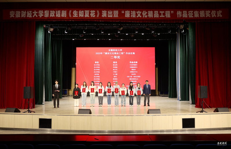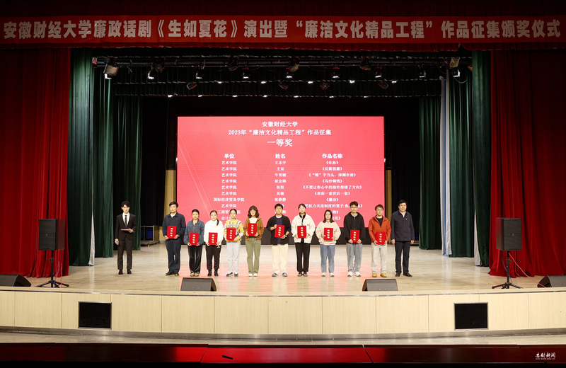 为扎实开展学习贯彻习近平新时代中国特色社会主义思想主题教育和纪检监察干部队伍教育整顿,将清廉文化、廉洁教育渗透进校园文化,推动清廉文化根植于师生内心,推动建设新时代清廉校园,4月26日晚,学校在龙湖东校区艺术楼报告厅举办《生如夏花》廉政话剧展演暨2023年度“廉洁文化精品工程” 优秀作品颁奖仪式。校党委书记虞宝桃、校党委副书记杨烨到场并为获奖单位和优秀作品获得者颁发奖牌和证书,学校学习贯彻习近平新时代中国特色社会主义思想主题教育领导小组成员、全校纪检监察干部、学生党员代表近800人参加活动。