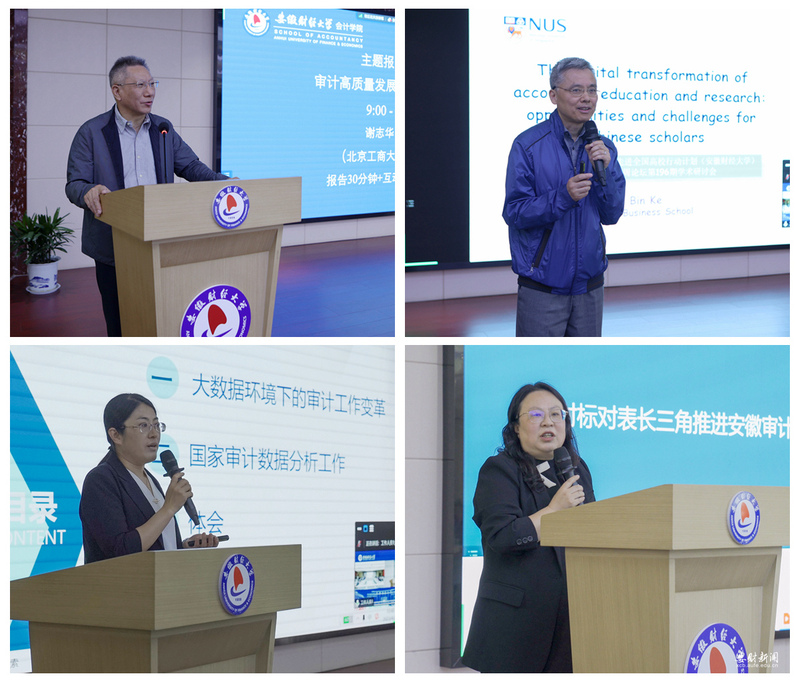 论坛分为上下两场,上半场由铜陵学院党委副书记、院长倪国爱教授主持,下半场由安徽省审计科研所所长章笑春研究员主持。会上,北京工商大学原副校长谢志华教授探讨了审计高质量发展和新技术融合的问题,强调新技术的产生是为了解决信息不对称问题;新加坡国立大学商学院柯滨教授探讨了数字化时代对会计教育和研究的机遇和挑战,提出了产学研高度融合的观点;审计署审计科研所李培培副研究员探讨加大数据分析力度对审计工作高质量发展的益处,从审计变革和国家审计数据分析工作等方面展开;我校陈矜教授探讨了对标长三角推进安徽审计高质量发展的对策研究。